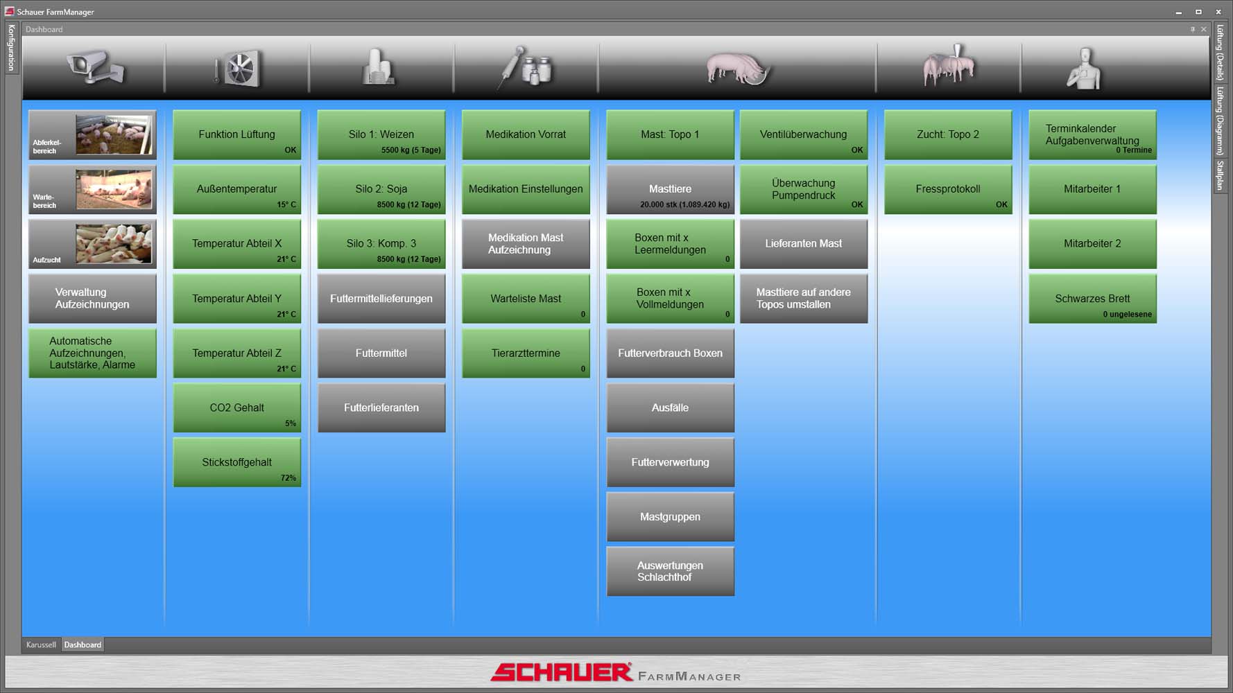 FarmManager (LINK zu EN) podjetja Schauer je sodoben sistem za upravljanje in spremljanje uspešne proizvodnje prašičev. Program, združljiv z več uporabniki in omrežjem, omogoča shranjevanje podatkov v resničnem času ter vrednotenje vse podatkov o stanju in porabi živali in naprav vklj. z alarmnim sistemom.